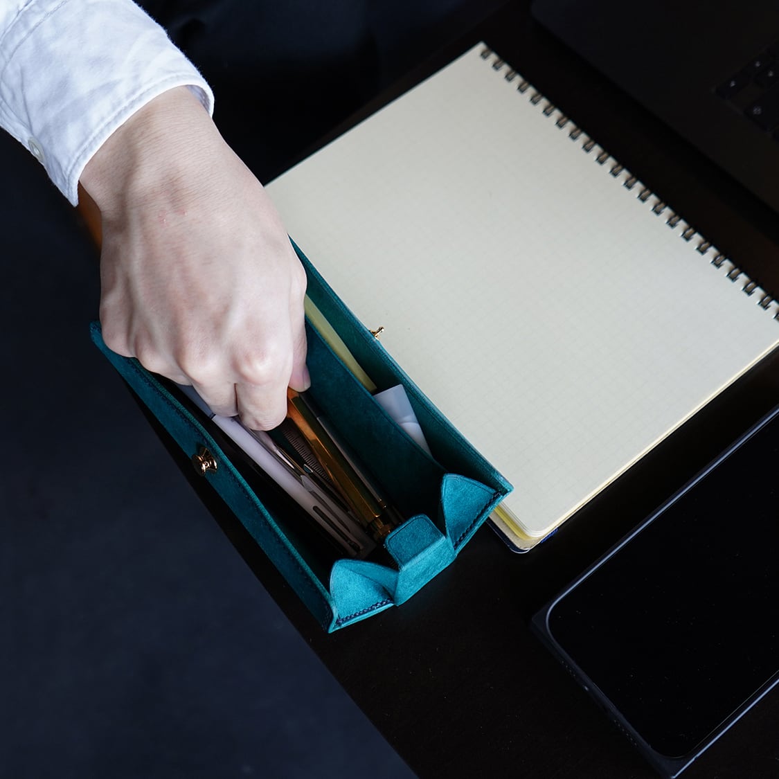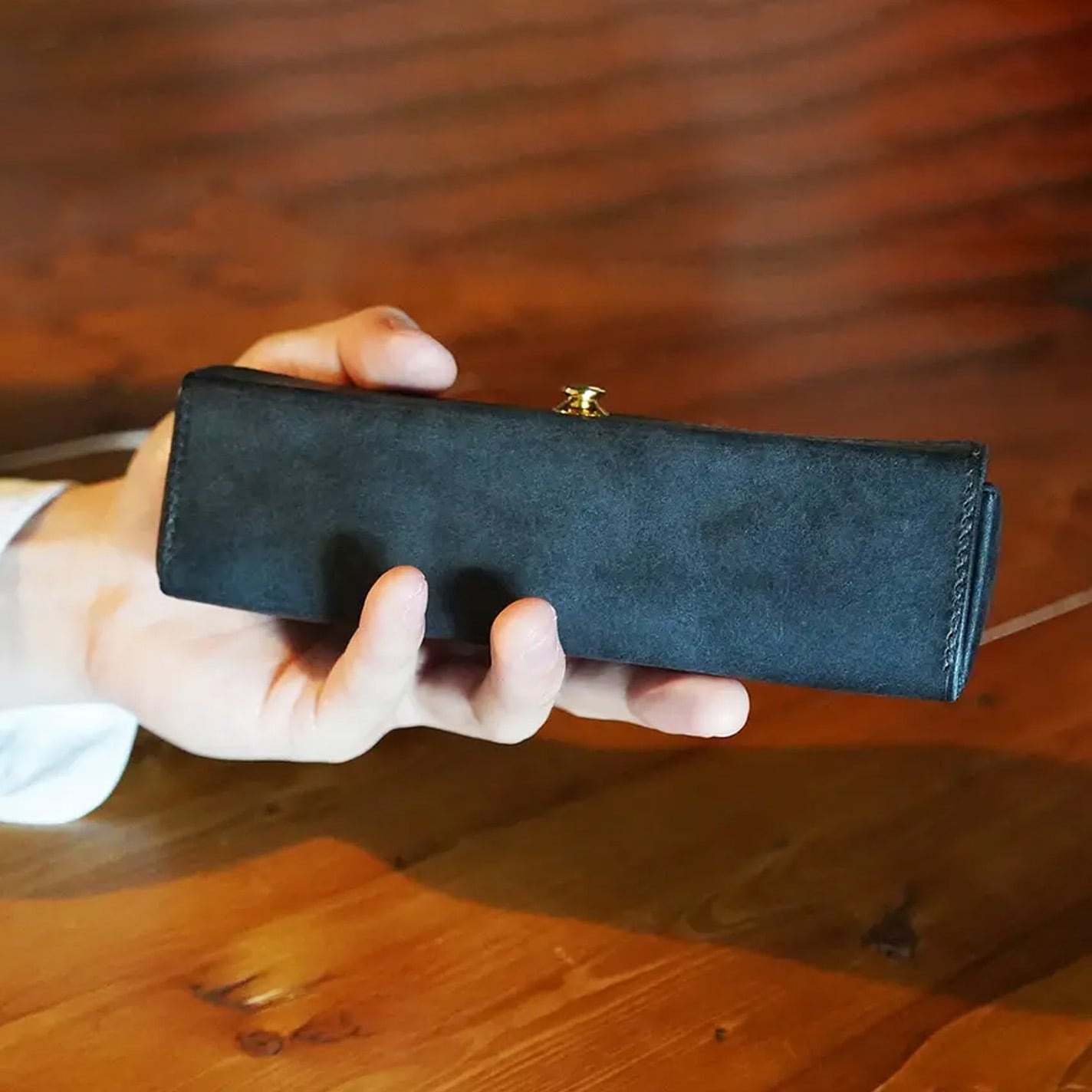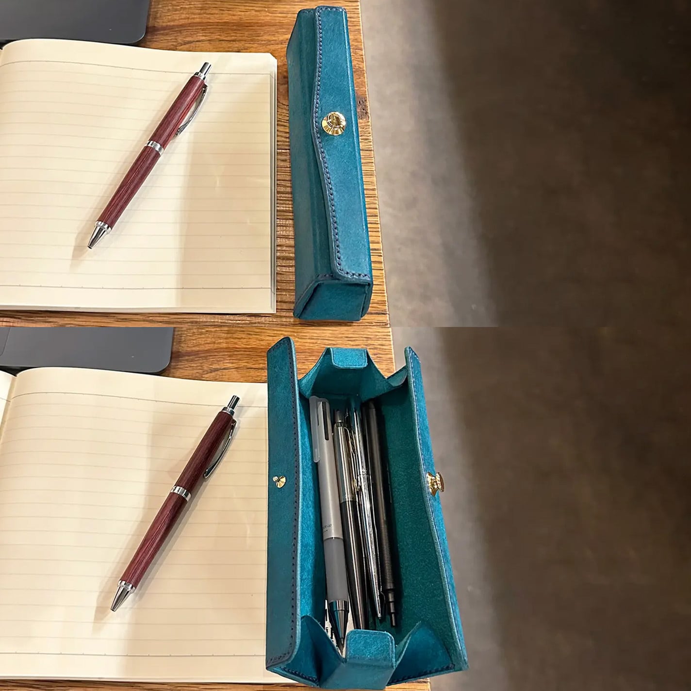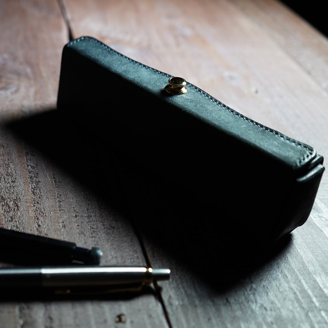 ファスナータイプとは違い、ワンタッチ開閉のドイツホック、さらにトップオープン仕様なので、机に置いたまま片手で簡単に瞬時に開閉が可能です!