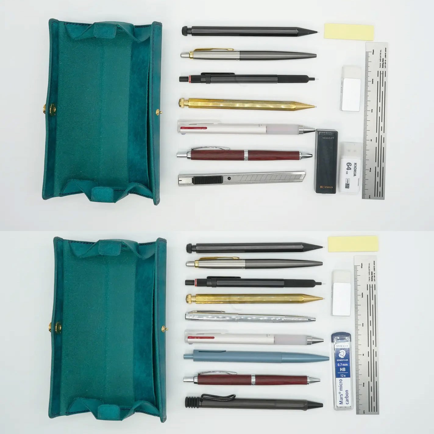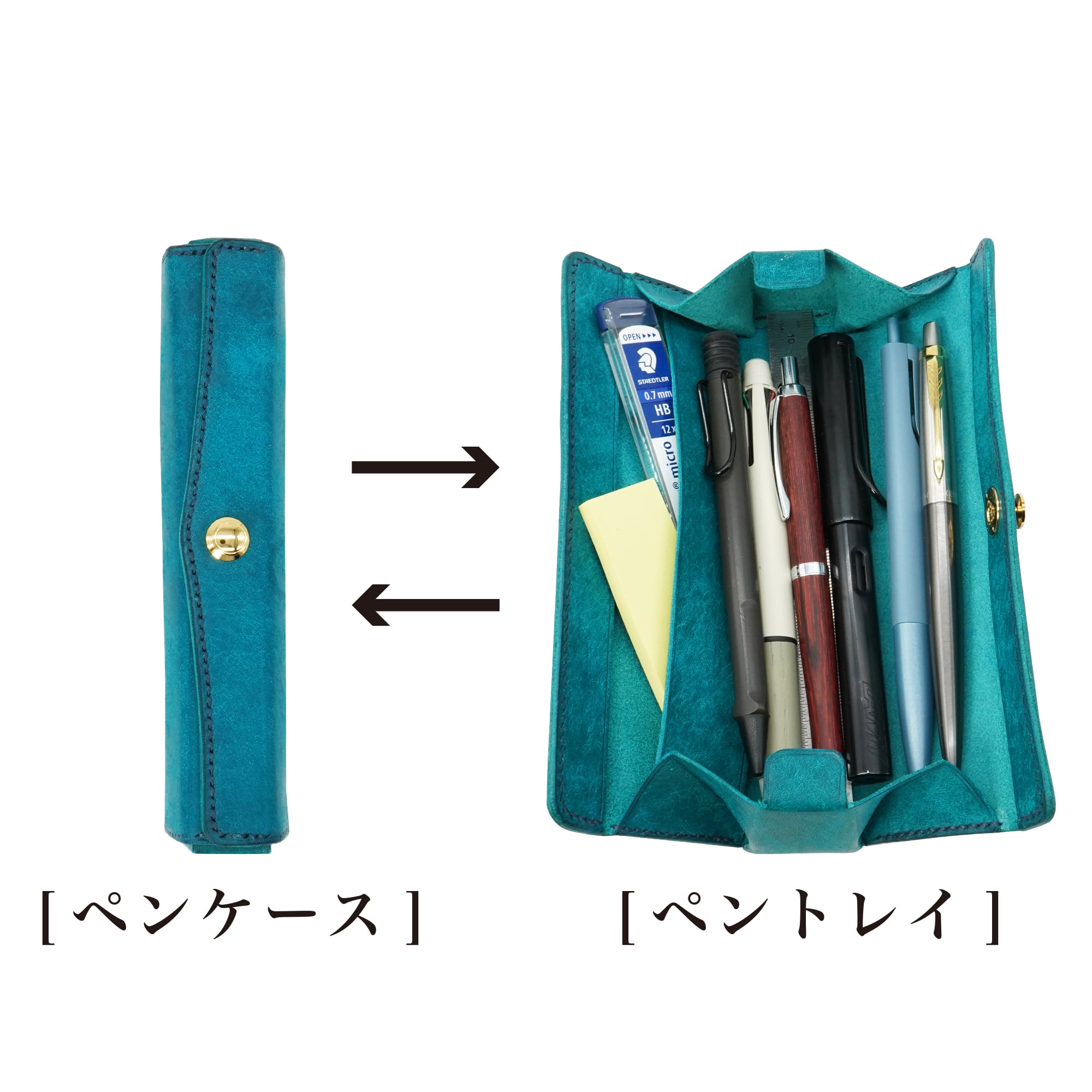 ドイツホックをつまんで外すとガバッと大きく開き、ペントレイに変形して中身を全て一目で確認可能!見やすく出し入れがしやすい!