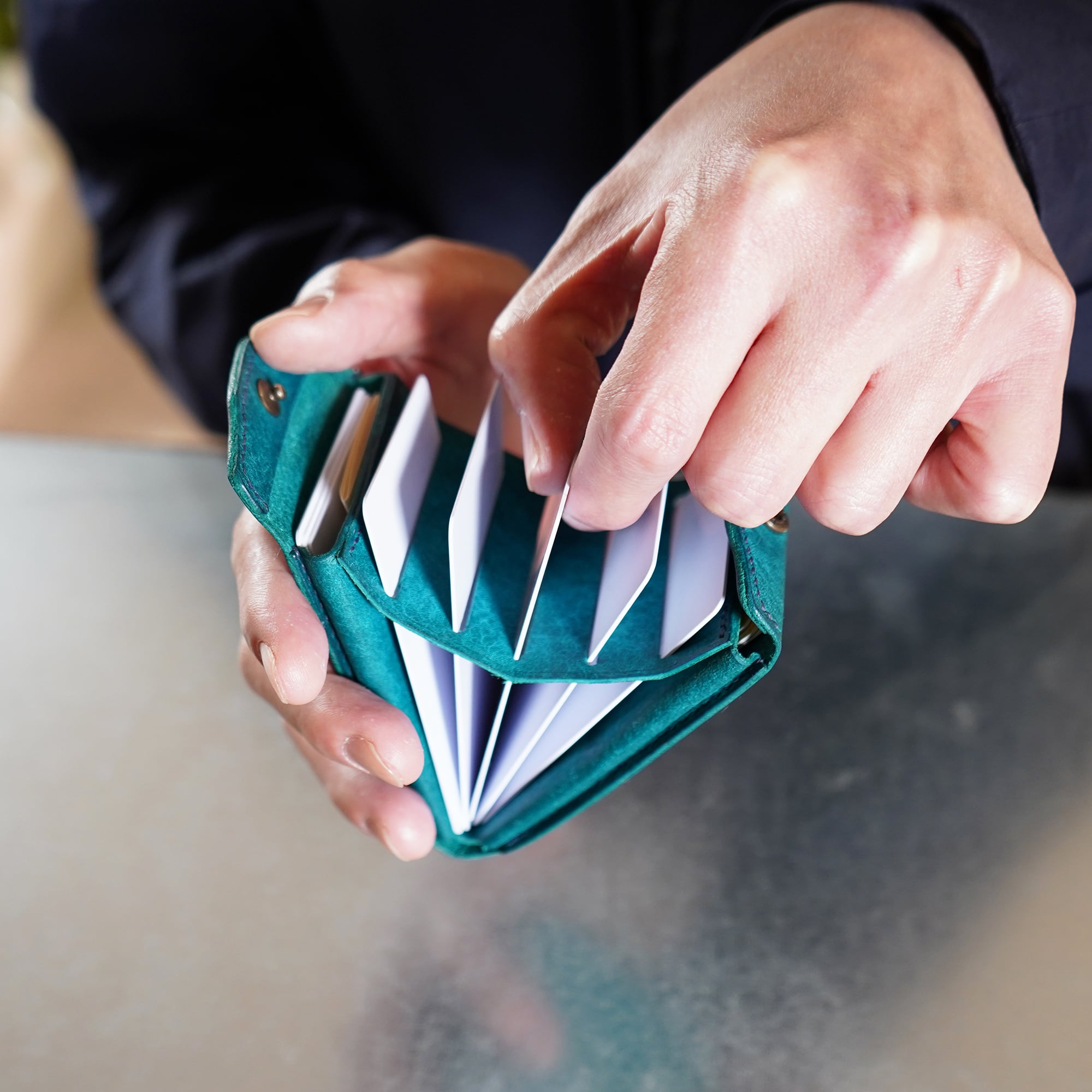 ガバッと大きく開いて、瞬時にカードを見渡せる!カードの出し入れもしやすい超時短形状。